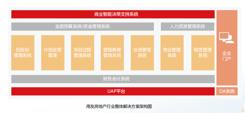 用友房地产行业整体解决方案,是完美结合地产企业管理业务成功最佳实践,运用商务云计算技术平台构建,支持各类地产企业项目开发经营业务协同及管控需求应用的一体化信息系统解决方案。房地产整体解决方案细分为项目管理、客户营销与关系管理、财务管理、以及业务支撑体系等子方案,同时基于统一技术平台,可以“整体规划,分块建设”,即可以按照企业的发展现状和信息化的需求,选择一个或者几个子方案(如项目管理、营销等等),逐步分期建设.