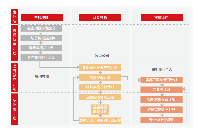 进度是项目的一个核心管理维度,也只有结合了进度才能真正解决超付与提前支付等困扰房地产企业的管理问题。通过对项目进度计划的编制,并且对项目进度计划的实际执行过程进行严格控制,同时通过完善项目进度计划的分析体系,在以考核项目承建商和项目经理的评价指标的基础上,构建一套完整项目进度全流程管理体系。