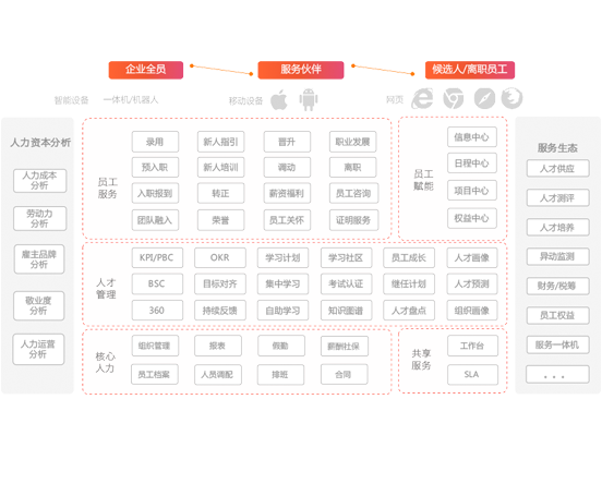 n 多类型招聘模式:社会招聘、校园招聘、实习生招聘、猎头推荐、内部招聘、内部推荐、海外招聘。不同招聘模式下,职位与简历既可单独管理也可集中管理